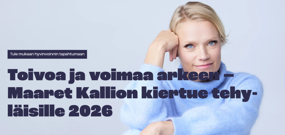 Miten jaksaa arjessa, kun sote- ja varhaiskasvatusalan työ kuormittaa ja muutos on jatkuvaa? Osallistu hyvinvoinnin tapahtumiimme, jotka järjestämme kahdeksalla paikkakunnalla vuonna 2026. Tapahtumissa kuulemme kouluttajapsykoterapeutti Maaret Kallion ajatuksia toivosta ja sen voimasta. Mukana on myös Tehyn puheenjohtaja Millariikka Rytkönen.